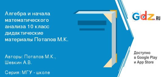 ГДЗ к дидактическим материалам по алгебре и начала математического анализа 10 класс Потапов М.К. представляет собой готовый набор решений для различных типов математических задач, которые могут быть предложены в рамках учебной программы для десятиклассников. Этот ресурс может быть полезен как для учеников, испытывающих трудности в решении сложных заданий, так и для тех, кто хочет проверить правильность своих ответов или изучить новые методы решения. Пособие полностью соответствует всем требованиям федерального государственного образовательного стандарта полного среднего образования.