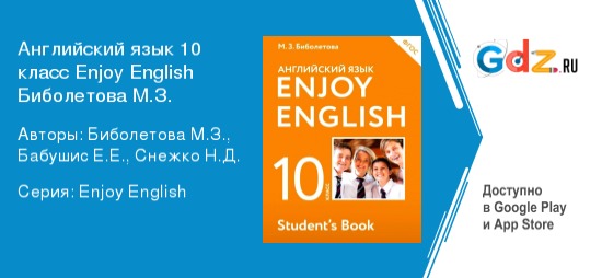 М.З. Биболетова. Е.Е. Бабушис, Н.Д. Снежко предлагают заниматься по их учебно-методическому комплексу. На данной странице нашего сайта представлена полная версия решебника для десятиклассников. Его подготовила к изданию известная отечественная компания «АСТ/Астрель», серия «Enjoy English» (2016-2020 годы). Готовые домашние задания оказывают школьникам ежедневную помощь, разъясняют непонятные моменты, позволяют готовиться к проверочным работам, ответам на уроках.