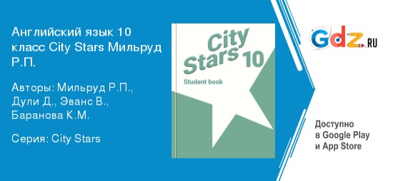 «ГДЗ по английскому языку за 10 класс City Stars Мильруд Р. П., Дули Д., Эванс В., Баранова К. М. (Просвещение)» поможет без труда освоить перечисленные разделы учебника и позволит достичь стабильного получения положительных оценок за работу на уроке и правильное выполнение домашнего задания.