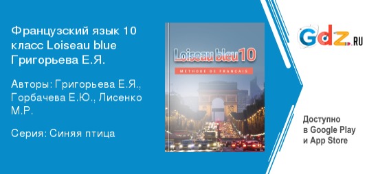 Французский язык является одним из самых распространённых языков в мире. Он является официальным языком большинства стран Европы. Французский – это язык любовь. С ним можно говорить о чём угодно и с кем угодно. Этот язык не только позволит вам выразить свои мысли и чувства, но и будет способствовать развитию вашей личности и вашему творчеству. . Изучение французского языку является неотъемлемой частью образования, которая помогает получить знания, расширить кругозор и стать конкурентоспособным на международном рынке труда. Учебник по французскому языку за 10 класс раскроет перед учениками все тайны французского языка, а также все тонкости изучения этого языка. Он поможет освоить не только грамматические правила, но и научит правильно воспринимать французскую речь на слух. В нём собраны самые необходимые знания, которые помогут в изучении французского языка, и помогут преодолеть все трудности. Учебник также поможет не только освоить разговорный язык, но и научит писать интересные письма, вести беседу на разные темы и даже читать французские книги. Ученик сможет читать самые популярные французские романы и фильмы. Благодаря этому десятиклассник сможет не только узнать много нового, но и расширить свой кругозор. ГДЗ к учебнику по французскому языку 10 класс Loiseau blue от Григорьевой помогут десятикласснику получить ответы на все вопросы, которые могут возникнуть при изучении той или иной темы. Это не просто сборник ответов, а пособие, в котором собраны все возможные примеры и пояснения, а также ответы по грамматике. Он содержит основные задания, примеры, решения которых помогут научиться, правильно выполнять упражнения. Все задания, которые содержатся в нём, имеют чёткое разъяснение на русском языке. Это поможет ученику понять, что именно он делает в каждом задании. Если использовать эти готовые задания, то десятиклассник сможет не просто выучить французский язык, но и научится правильно писать и говорить. С помощью этого пособия, ученик сможет освоить предмет, даже если он не обладает навыками чтения и письма. Оно поможет разобраться в сложных темах и понять, как нужно правильно их излагать. Это пособие призвано помочь каждому десятикласснику повысить уровень владения французским языком. Здесь содержатся все необходимые ответы к упражнениям из учебника. В нём также есть решения к заданиям, которые являются сложными для понимания. Именно этот решебник считается отличным помощником для тех, кто хочет проверить себя. Он поможет ученикам не только проверить правильность решения, но и понять суть процесса. Так, например, можно будет понять, как правильно и грамотно писать слова и выражения на французском языке, а также как их правильно использовать в речи. Также есть готовые домашние задания, тестовые задания, переводы текстов и многое другое. Понять, как правильно выполнять домашнее задание, а также правильно писать и говорить на французском языке теперь не проблема. Всё что нужно – это пользоваться этим ГДЗ, открыв его найти там необходимую информацию. Это самый оптимальный выбор для школьников, которые хотят повысить свой уровень владения французским языком. Он сделает уроки более увлекательными и интересными, а также и намного проще. Ведь с помощью этого пособия можно будет получить самые необходимые знания, которые при