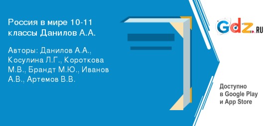 Школьная программа ГДЗ по истории России в мире за 10‐11 класс Авторы: Данилов А.А., Косулина Л.Г., Короткова М.В., Брандт М.Ю., Иванов А.В., Артемов В.В. часть 1, 2 Базовый уровень