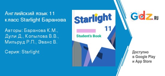 Подтянуть знания по английскому в одиннадцатом классе стремятся практически все ученики вне зависимости от того, сдают они по предмету государственный экзамен или нет. Верным помощником в обоих случаях станет ГДЗ по Английскому языку за 11 класс: Баранова К.М. Starlight 11 (Звездный английский). Учебная программа по предмету в этом году направлена на закрепление всех полученных ранее знаний, а также разбор сложных языковых конструкций и устойчивых выражений. Каждый выпускник должен уверенно обладать навыками письменной и устной английской речи, чтобы продолжить обучение в вузе. Иметь под рукой надежную помощь не будет лишним.