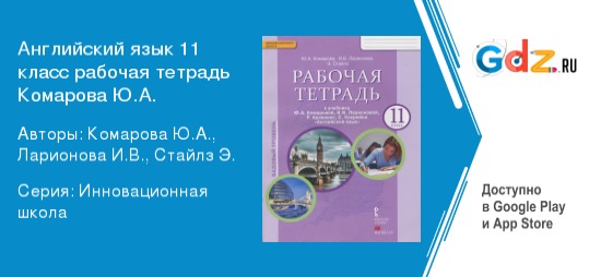 Выпускной класс означает огромное количество учебных забот. Подростки готовятся к ЕГЭ, сосредоточившись на экзаменационных дисциплинах. Но при этом нельзя ослаблять внимание и к другим наукам, времени на исправление ошибок и пробелов в знаниях уже нет. Впрочем, старшеклассника не нужно убеждать в важности такого предмета как английский язык. Без элементарного словарного запаса человек не сможет общаться даже с собственным компьютером. Но недостаточно понять значение предмета – нужно много, упорно работать над его изучением. И в этом школьникам поможет отличный виртуальный наставник «ГДЗ Рабочая тетрадь по английскому языку за 11 класс Комарова, Ларионова Инновационная школа (Русское слово)».