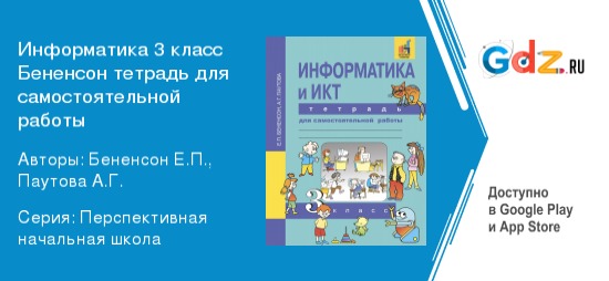 Всем обучающимся очень рекомендуем наш уникальный сервис, на котором находятся прекрасные ГДЗ по информатике за 3 класс Бененсон тетрадь для самостоятельной работы. Такое подспорье в любой момент станет надежным помощником, который подскажет, что и как надо делать, чтобы повысить свою успеваемость. Конечно, взрослым кажется, что сейчас рано об этом думать, так как на третьей ступени образования школьная программа простая и даже элементарная. Но не забывайте, что малышам все равно тяжело, так как этот предмет является техническим и вскоре их ждут длинные и непонятные формулы для различных вычислений. Подготовиться к этому лучше заранее и вовремя усваивать всю необходимую информацию на уроках. Ведь без этого невозможно получение пятерок и четверок в дневник и тетрадки.