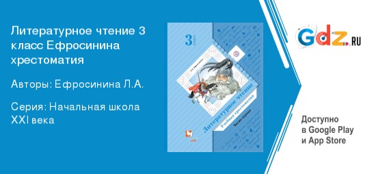 Любовь к чтению формируется ещё в детстве. Это не только развлечение, но и источник знаний. Литературное чтение является одними из самых сложных уроков. Ведь в этом возрасте ребёнок начинает интересоваться не только сказками, но и произведениями малых жанров, а также поэзией. Для того чтобы помочь ребёнку подготовиться к уроку необходимо воспользоваться услугами ГДЗ к хрестоматии для литературного чтения 3 класс автор Ефросинина. Пособие полностью соответствует всем требованиям федерального государственного образовательного стандарта начального общего образования.