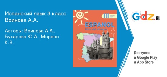 На уроках испанского языка в 3 классе используются разнообразные виды учебных пособий, которые позволяют лучше усвоить материал. ГДЗ к учебнику по испанскому языку 3 класс автор Воинова А.А. является одним их лучших помощников в изучении языка. Пособие полностью соответствует всем требованиям федерального государственного образовательного стандарта начального общего образования.