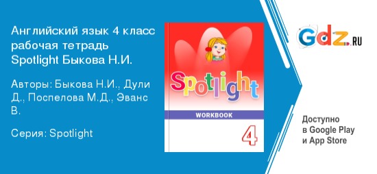ГДЗ по английскому языку за 4 класс рабочая тетрадь Spotlight Быкова - это отличное решение для того, чтобы правильно распределить нагрузку. Рабочая программа с изучением иностранной словесности на четвертом году обучения распространенное, но нелегкое задание. Каким бы одаренным не был школьник, преподаваемый материал не до конца усваивается за время урока, что нередко приводит к уменьшению интереса к обучению.