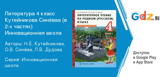 ГДЗ по литературе за 4 класс Кутейниковой Н. В. и Синёвой О. В. (в 2-х частях) Инновационная школа представляет собой пособие, состоящий из двух частей. Оно предназначено для учащихся начальной школы и соответствует Федеральному государственному образовательному стандарту начального общего образования.