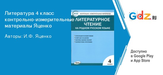 ГДЗ к контрольно-измерительным материалам составлено в строгом соответствии с учебной программой по литературе для 4 класса. Он включает ответы на все основные вопросы, тесты и задания, которые ученики выполняют в рамках контрольно-измерительных материалов, составленных Яценко И.Ф.