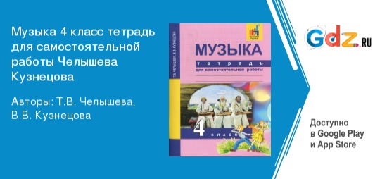 ГДЗ к тетради для самостоятельной работы по музыке 4 класс авторы Челышева Т.В., Кузнецова В.В. даёт возможность ученикам не только проверить свои знания в различных музыкальных произведениях, но узнавать много нового о них. Пособие полностью соответствует всем требованиям федерального государственного образовательного стандарта и школьной программы начального общего образования.