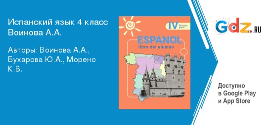 Изучение испанского языка в начальной школе несёт в себе не только образовательные и воспитательные функции, но и помогает подготовиться к уроку. Изучение иностранного языка это всегда кропотливый труд. К сожалению, многие ученики не могут осилить даже элементарные правила грамматики на начальном этапе. На помощь приходит ГДЗ по испанскому языку 4 класс автор Воинова А.А., который и поможет разобраться в самых сложных моментах. Пособие полностью соответствует всем требованиям федерального государственного образовательного стандарта начального общего образования.