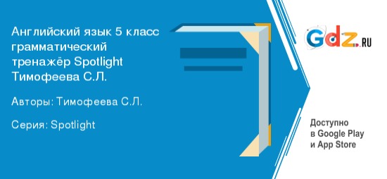 На уроках английского языка пятиклассники продолжают изучать основные грамматические структуры, такие как времена глаголов, местоимения, артикли, предлоги и союзы. ГДЗ к грамматическому тренажёру по английскому языку Spotlight Тимофеевой С.Л. поможет освоить грамматические правила и структуры английского языка. Пособие полностью соответствует всем требованиям федерального государственного образовательного стандарта начального общего образования.