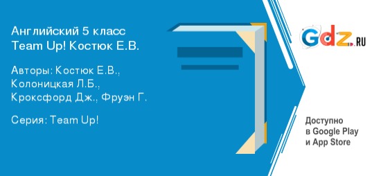 ГДЗ по английскому языку для 5 класса "Team Up!" автора Костюк Е.В. оказывает существенную помощь ученикам в изучении английского языка. Пособие полностью соответствует всем требованиям федерального государственного образовательного стандарта основного общего образования.