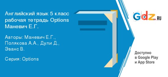 Изучение английского языка в 5 классе связано со многими аспектами, такими как грамматика, произношение, чтение, письмо и аудирование. ГДЗ к рабочей тетради по английскому языку 5 класс Options Маневич Е.Г. поможет приобрести необходимые навыки и умения. Пособие полностью соответствует всем требованиям федерального государственного образовательного стандарта и учебной программы основного общего образования.