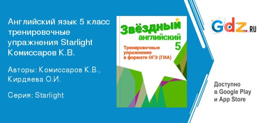 Программа по английскому языку в 5 классе становится уже более сложной и насыщенной, чем в начальных классах. Учащиеся начинают изучать новые темы, такие как “Семья”, “Друзья”, “Школа” и “Хобби”, а также грамматику и лексику на более высоком уровне. Кроме того, в этом классе ученики начинают изучать тексты на английском языке, смотреть фильмы и слушать музыку на английском языке. Все это помогает им развивать свои навыки говорения, чтения, письма и аудирования на английском языке. ГДЗ к тренировочным упражнениям по английскому языку 5 класс Starlight автор Комиссаров К.В. помогает ученикам проверить свои ответы и понять, где они допустили ошибки. Это позволяет им лучше понять материал и улучшить свои знания языка. Пособие полностью соответствует всем требованиям федерального государственного образовательного стандарта начального общего образования.
