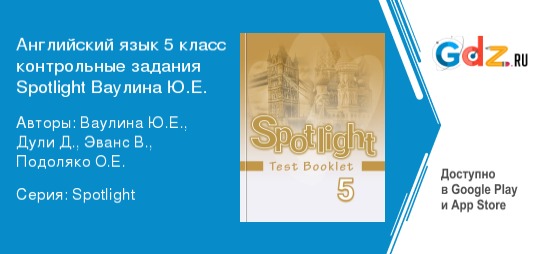 Пятиклассники в этот непростой период общеобразовательного обучения справятся с требовательной программой первого иностранного, если заручатся поддержкой информативного интернет-пособия «ГДЗ по английскому языку 5 класс контрольные задания Spotlight Ваулина, Дули, Эванс, Подоляко (Просвещение)». Онлайн-решебник является примером полезного дополнения к основному учебно-методическому комплекту по дисциплине. Окажется ценным приобретением для электронной библиотеки пятиклассника.
