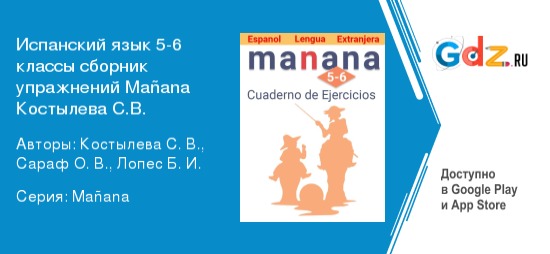 ГДЗ к сборнику упражнений по испанскому языку 5-6 класс Manana Костылева С.В. станет отличным помощником во время обучения испанскому языку. Пособие полностью соответствует всем требованиям федерального государственного образовательного стандарта основного общего образования.