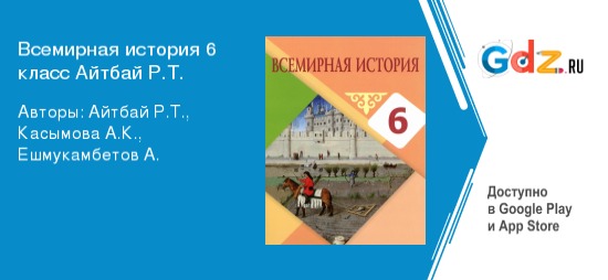 «ГДЗ по Всемирной истории 6 класс Айтбай, Р. Т., Касымова, А. К., Ешмукамбетов, А. (Атамура)» с этими задачами справляется на раз-два. Он отвечает на итоговые задания ко всем параграфам и главам пособия. Вся программа доступна 24 часа в сутки онлайн.