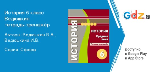 ГДЗ по истории 6 класс тетрадь-тренажер авторов Ведюшкиных от издательства «Просвещение» представлен в онлайн-формате, что значительно упрощает его использование. Данное пособие можно открыть на любом устройстве в удобное для вас время, так как оно доступно 24 часа в сутки. Польза решебника: