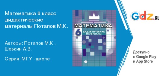 ГДЗ дидактические материалы по математике за 6 класс Потапов М. К., Шевкин А. В. – это полезное онлайн-пособие, которое создано специально для поддержки учеников средней школы. Этот сборник включает в себя правильные образцы ко всем номерам из основного учебника. Необходимо внимательно изучать всю теорию и усердно практиковаться, чтобы впоследствии легко усваивать алгебру и геометрию. А достичь максимально эффективного результата поможет представленный онлайн-решебник.