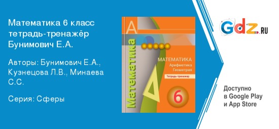 На шестой ступени обучения заканчивается изучение математики как самостоятельной науки, в дальнейшем это будут уже два новых предмета — алгебра и геометрия. И они представляют еще большую сложность, каждая основывается на чем-то определенном. Первая рассматривает свойства величин, которые выражены буквами, независимо от числового их значения. Она будто расширяет и обобщает арифметику, которая была ранее. Вторая же анализирует пространственные формы и законы их измерения. Трудно сказать, какая из них приносит больше проблем школьникам, однако преуспевать нужно в каждой, так как от этого зависит качество аттестата. А этот документ всегда внимательно рассматривает приемная комиссия при поступлении абитуриента в высшее учебное заведение. Поможет в освоении таких сложных предметов ГДЗ по Математике за 6 класс Тетрадь - тренажёр к учебнику Бунимович.