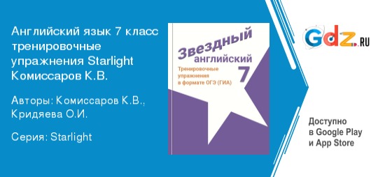 Семиклассники на уроках справятся со всеми грамматическими и лексическими темами из учебно-методического комплекта по дисциплине, если воспользуются поддержкой онлайн-пособия «ГДЗ по английскому языку 7 класс тренировочные упражнения в формате ОГЭ Starlight Комиссаров, Кридяева (Просвещение)». Сборник верных ответов составлен специально для дидактического дополнения к учебнику. Школьники осилят самые сложные номера вопросов и практических упражнений.