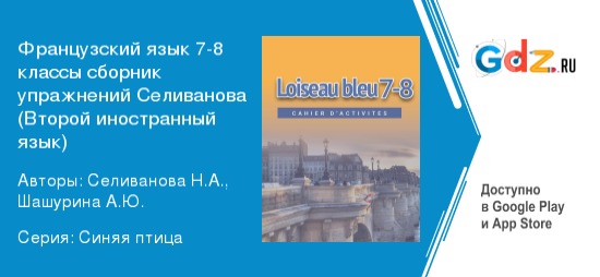ГДЗ к сборнику упражнений по французскому языку 7-8 классы Селиванова Н.А. (второй иностранный язык) помогает разобраться в сложных моментах. Пособие полностью соответствует всем требования федерального государственного образовательного стандарта основного общего образования.
