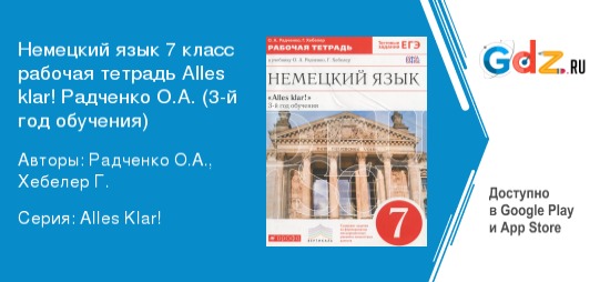 Для тех, кто комплексно подошел к изучению дисциплины, представляем ГДЗ рабочая тетрадь по немецкому языку 7 класс Alles klar! 3-й год обучения Радченко. Ведь несмотря на то, что немецкий не стал главным мировым языком, он распространен по всему земному шару и является государственным в Германии, Австрии, Дании, Швейцарии, Лихтенштейне и Люксембурге. И безусловно, пользу изучения любого языка сложно переоценить, ведь оно дает знание культуры другого народа, исторических и географических особенностей чужой страны, свободный доступ к источникам информации, которых нет на русском, возможность учиться и работать за рубежом.