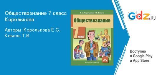«ГДЗ по обществознанию за 7 класс Королькова, учебник, (Академкнига)» помогает школьникам, перешедшим в седьмой класс, подробно изучить сферы жизни общества. Учебная программа данного предмета подразумевает обобщение и структурирование знаний, полученных в предыдущие годы. Это помогает понять принципы существования общественных систем, но только если школьник будет анализировать информацию, представленную в ГДЗ.