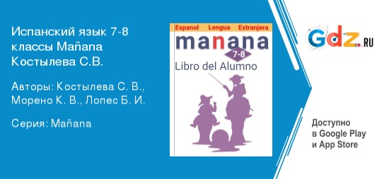 Изучение испанского языка несёт в себе, как и массу положительных моментов, так и множество трудностей и проблем. При этом важно знать, что при изучении языка необходимо не только понимать сказанное, но и уметь правильно говорить. ГДЗ к учебнику по испанскому языку 7-8 класс Manana Костылёва С.В. поможет освоить сложные грамматические конструкции и понять логику испанских слов. Пособие соответствует всем требованиям федерального государственного образовательного стандарта и рабочей программы.