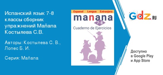 Изучение испанского языка в 7-8 классе считается одним из самых сложных этапов в освоении иностранного языка. Объясняется это тем, что в это время у школьников уже сформирована база знаний, и они стремятся её расширить, а также и расширить словарный запас. ГДЗ к сборнику упражнений по испанскому языку 7-8 класс Manana Костылёва С.В. является отличным помощником в изучении этого непростого, но интересного языка. Пособие полностью соответствует всем требованиям федерального государственного образовательного стандарта основного общего образования.