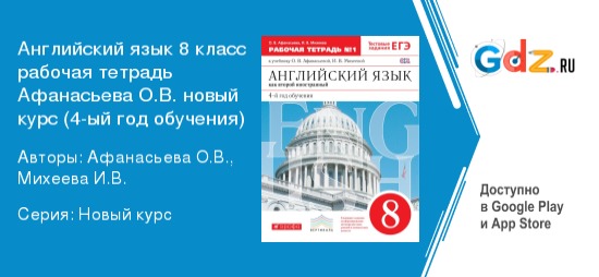 Решебник рабочая тетрадь новый курс по английскому языку за 8 класс Афанасьева, Михеева ФГОС часть 1, 2. Все ученики, которые готовятся перейти в старшую школу, понимают очевидную ответственность данного периода. Ведь в именно это время не только добавляются новые предметы, но и значительно усложняются уже имеющиеся в программе. И для того, чтобы не ухудшить текущую успеваемость и сохранить заработанную репутацию, следует использовать все возможные ресурсы, к самым известным из которых относятся сборники с ГДЗ. Предложенное пособие поможет каждому учащемуся значительно повысить свои знания, не затрачивая много сил и времени на постоянные занятия с репетиторами.