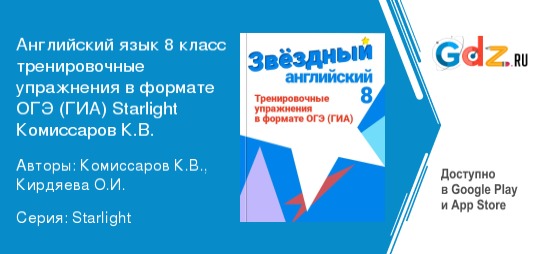 Несмотря на то что сдача Обязательного Государственного Экзамена (ОГЭ) проходит по окончании 9 класса, подготовку к нему школьники начинают уже в 8 классе. Многие ребята в качестве экзаменационного предмета выбирают английский, поможет с изучением ГДЗ тренировочные упражнения в формате ОГЭ (ГИА) Starlight по английскому языку за 8 класс Комиссаров Углубленный уровень.