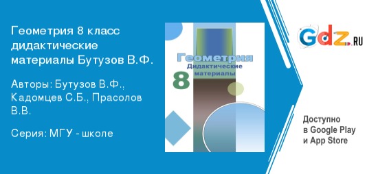 «ГДЗ по геометрии за 8 класс, дидактические материалы, Бутузов, Кадомцев (Просвещение)» с уверенностью можно назвать лучшим учебно-вспомогательным пособием. Специалисты уверены в том, что данный решебник в скором времени войдет в список обязательной литературы. На это есть ряд причин. Во-первых, книга во много раз упрощает образовательный процесс. Во-вторых, благодаря ей освоить курс сможет даже сильно отстающий от рабочей программы ученик.