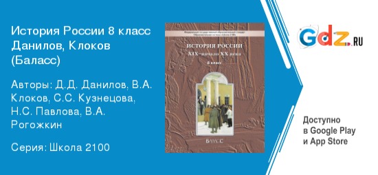 История набирает большую популярность, как экзамен по выбору среди современных выпускников. Знание данного предмета открывает огромный выбор гуманитарных направлений для поступления в будущем. Несмотря на то, что многим школьникам кажется, будто до первых ответственных экзаменов еще далеко, именно сейчас закладываются фундаментальные знания по дисциплине. «ГДЗ История России 19-начало 20 века за 8 класс Данилов, Клоков, Кузнецова, Павлова, Рогожкин (Баласс)» станет верным другом для учеников, которые стремятся повысить свой уровень понимания предмета и исправить плохие оценки.