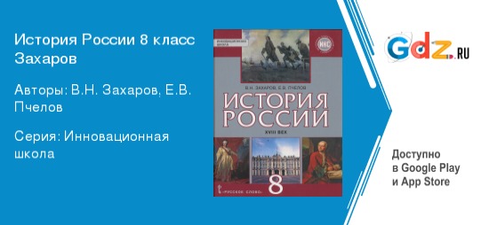 В восьмом классе ещё далеко до экзаменов, поэтому ученику предоставляется отличная возможность проверить свои знания по всем предметам, определить проблемные темы и устранить все недостатки. В следующем учебном году начнётся интенсивная подготовка к Государственной Итоговой аттестации, и тогда не будет ни одной минуты для того, чтобы разобраться с непонятным материалом. С этой задачей успешно справляется «ГДЗ, Учебник по истории за 8 класс, Инновационная школа, Захаров, Пчелов (Русское слово)».