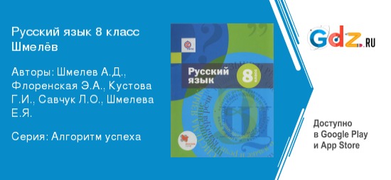 А.Д. Шмелев, Э.А. Флоренская, Г.И. Кустова, Л.О. Савчук, Е.Я. Шмелева написали учебник вместе с решебником (готовые домашние задания) для учеников 8 класса по русскому языку. Его изданием по состоянию на текущий момент (2019-2020 учебный год) занимается компания «Вентана-Граф». На нашем сайте вы найдете наиболее актуальную версию пособия с полным содержанием верных ответов. Они помогут вам подготовиться к урокам, восстановить знания в преддверии контрольных, проверочных и диагностических письменных работ, повысить общую грамотность и эрудицию.