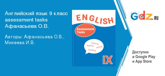 Даже, если ты свяжешь свою жизнь в будущем с рабочей профессией, это не значит, что тебе не пригодятся знания иностранных языков. Знания иностранного это свободное путешествие по другим странам, это музыка зарубежных композиторов, это и литература. Одним словом, это насыщенная и интересная жизнь. Поэтому, всерьез занимясь иностранным, возьми себе в помощники ГДЗ assessment tasks English 9 класс авторы: Афанасьева О.В., Михеева И.В. Весь материал и примеры ответов, этого пособия, помогут тебе разобраться в любом упражнении. Именно с его помощью ты приобретешь уверенность в своих способностях. Используя этот решебник вполне можно обойтись без репетиторов.