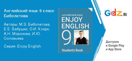 М.З. Биболетова, Е.Е. Бабушис, О.И. Кларк, А.Н. Морозова, И.Ю. Соловьева объединили имеющиеся у них знания, чтобы помочь учащимся 9 класса лучше осваивать английский язык. Это серия «Enjoy English» (2016-2020 годы). Книги издает компания «Аст/Астрель», которая известна своей образовательной литературой. Их можно без проблем найти во многих школьных библиотеках нашей родины, потому что учебники поставляются в соответствии с одобренными федеральными закупками.