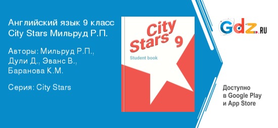 Решебник «Звезды моего города (City Stars)» по английскому языку для 9 класса Мильруд Р.П., Дули Д. поможет школьнику лучше разобраться с таким сложным предметом и может даже полюбить занятия. ГДЗ несет в себе только положительные моменты: