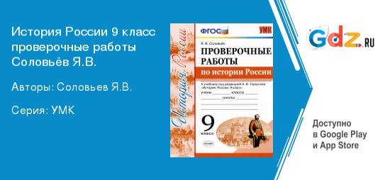ГДЗ к проверочным работам по истории Росси 9 класс под редакцией Соловьёва Я.В. поможет успешно подготовиться к контрольным работам и экзаменам по истории России. Пособие полностью соответствует всем требованиям федерального государственного образовательного стандарта основного общего образования. Учебник истории России в 9 классе Соловьёва Я.В. направлен на изучение следующих тем: