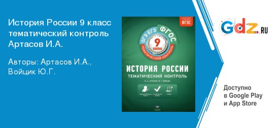 «ГДЗ по истории России за 9 класс к тематическому контролю Артасов» – отличный спутник для учеников, которые учатся в девятом классе. А всё потому, что историей интересуется большой процент детей в России. Однако школьники улавливают информацию поверхностно. По этой причине пользуются спросом различные фильмы про войну, а также повествования о бытии русских государей. А заучивать даты на уроках — очень скучно. Подавляющее большинство учеников гораздо легче воспринимает информацию в качестве развлечения. По этой причине очень важно найти хорошего спутника для образования ребёнка. Если родители учащихся станут использовать решебник, то это будет способствовать существенной экономии времени для того, чтобы проверить домашнюю работу у собственных детей. Поэтому появится больше времени, которое можно потратить на следующие занятия. Заодно сайт могут применять преподаватели. Это позволит им быстрее проверять домашние работы у школьников. Ведь, порой, просто нет времени, да и сил, чтобы целиком проверять, самостоятельно прорешивая всю работу.