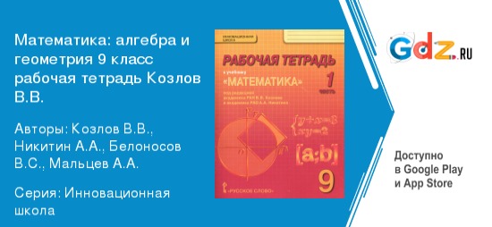 Математика это не просто цифры, а целая система. И чтобы хорошо в ней разбираться, нужно, очень много знать и уметь. ГДЗ к рабочей тетради по математике 9 класс алгебра и геометрия автор Козлов В.В. способствует лучшему усвоению материала. Пособие полностью соответствует всем требованиям федерального государственного образовательного стандарта основного общего образования.